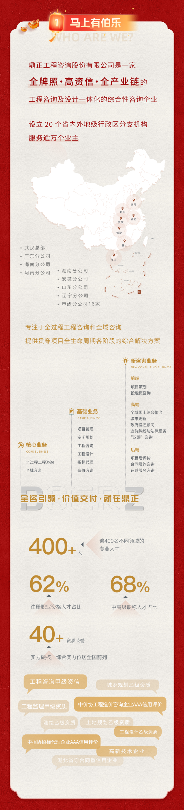 鼎正工程咨詢有限公司成立于2006年5月,公司具有工程咨詢、項目管理、工程造價咨詢、工程招標代理、土地規劃設計等多項專業咨詢資質...